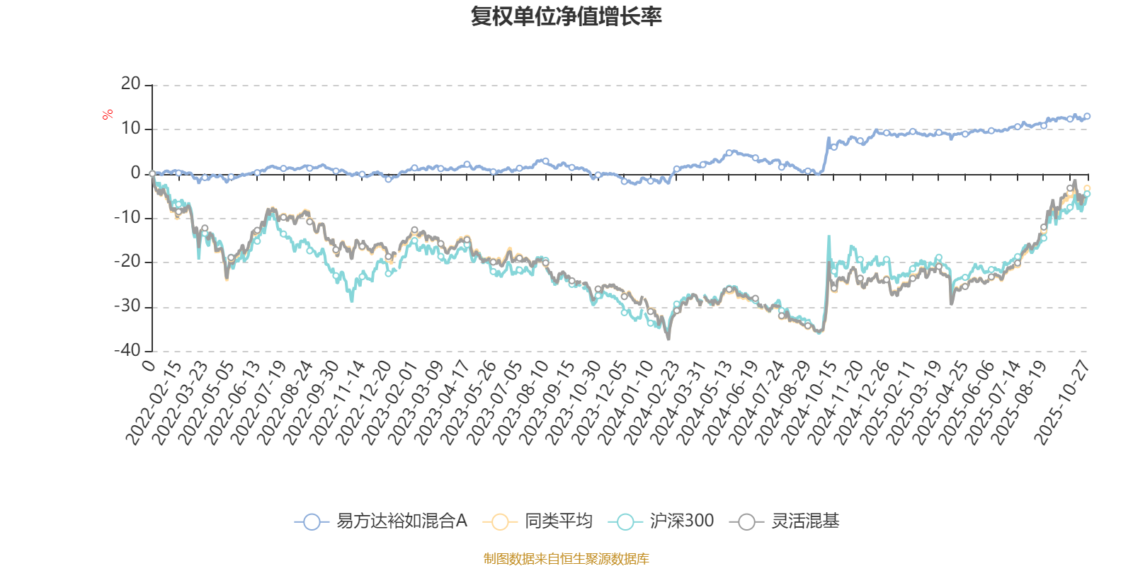 截至10月27日,易方达裕如混合A近三个月复权单位净值增长率为1.83%,位于同类可比基金1126/1287;近半年复权单位净值增长率为3.70%,位于同类可比基金1187/1287;近一年复权单位净值增长率为5.46%,位于同类可比基金1119/1287;近三年复权单位净值增长率为12.92%,位于同类可比基金694/1286。