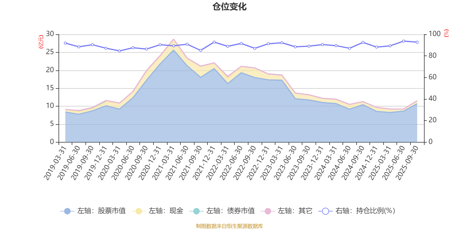 据定期报告数据统计,近三年平均股票仓位为90.38%,同类平均为85.89%。2025年上半年末基金达到93.74%的最高仓位,2020年一季度末最低,为84.64%。