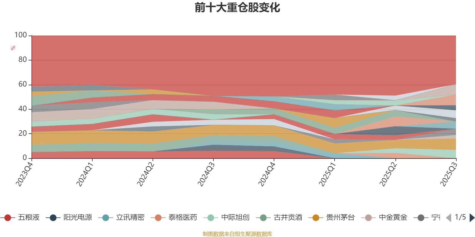 该基金持股集中度较高。截至2025年三季度末,基金十大重仓股分别是贵州茅台、工业富联、新易盛、中际旭创、沪电股份、深南电路、宁德时代、欣旺达、中金黄金、牧原股份。
