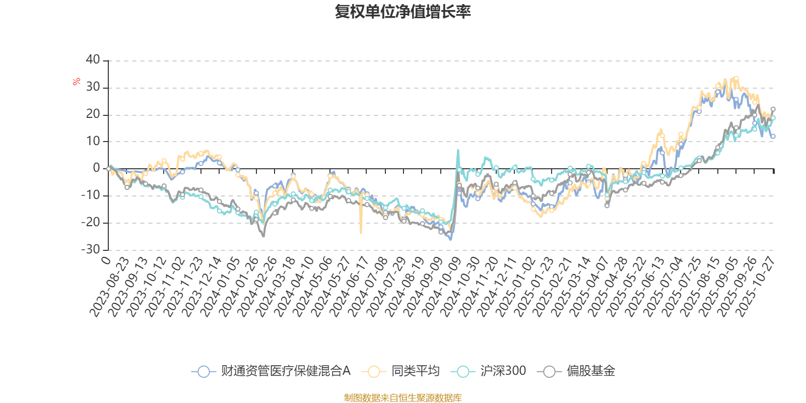 截至10月27日,财通资管医疗保健混合A近三个月复权单位净值增长率为-7.55%,位于同类可比基金89/106;近半年复权单位净值增长率为16.20%,位于同类可比基金79/104;近一年复权单位净值增长率为24.25%,位于同类可比基金60/101。