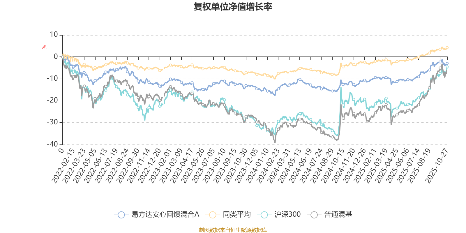 截至10月27日,易方达安心回馈混合A近三个月复权单位净值增长率为4.54%,位于同类可比基金138/629;近半年复权单位净值增长率为9.32%,位于同类可比基金114/629;近一年复权单位净值增长率为10.69%,位于同类可比基金128/623;近三年复权单位净值增长率为9.55%,位于同类可比基金361/557。