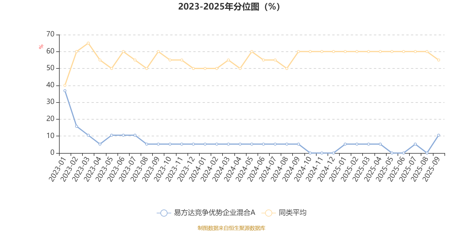 通过所选区间该基金净值增长率分位图,可以观察该基金与同类基金业绩比较情况。图为坐标原点到区间内某时点的净值增长率在同类基金中的分位数。