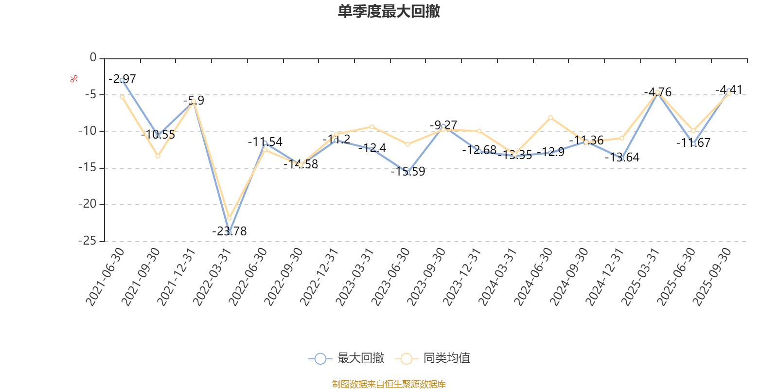 截至10月27日,基金近三年最大回撤为44.05%,同类可比基金排名17/20。单季度最大回撤出现在2022年一季度,为23.78%。