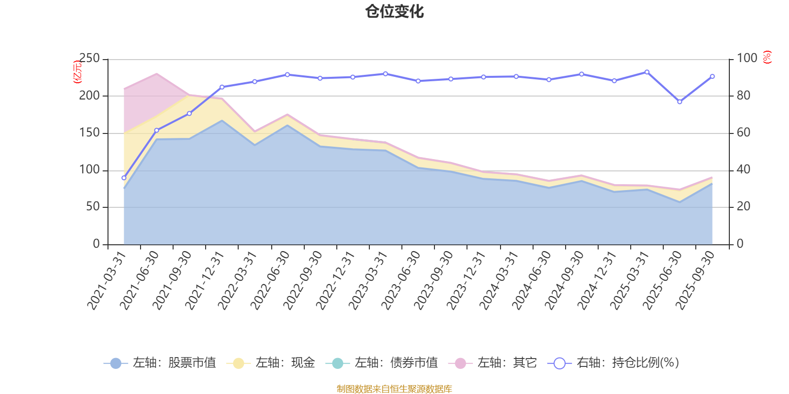 据定期报告数据统计,近三年平均股票仓位为89.22%,同类平均为86.79%。2025年一季度末基金达到93.03%的最高仓位,2021年一季度末最低,为35.96%。