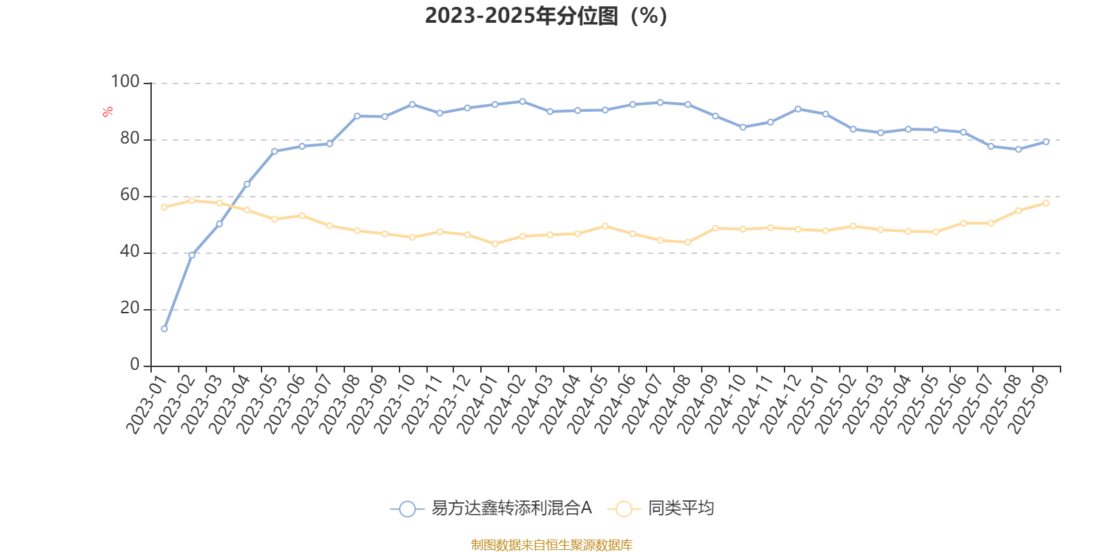 通过所选区间该基金净值增长率分位图,可以观察该基金与同类基金业绩比较情况。图为坐标原点到区间内某时点的净值增长率在同类基金中的分位数。
