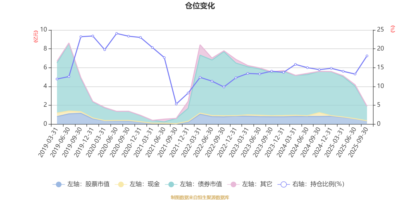 据定期报告数据统计,近三年平均股票仓位为14.38%,同类平均为19.02%。2020年上半年末基金达到24.08%的最高仓位,2021年三季度末最低,为5.34%。