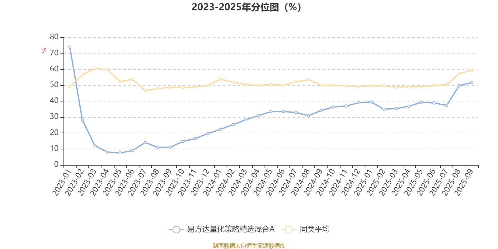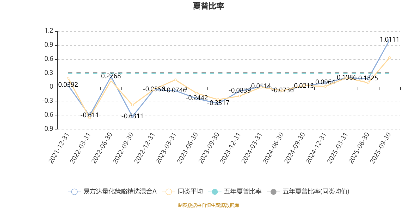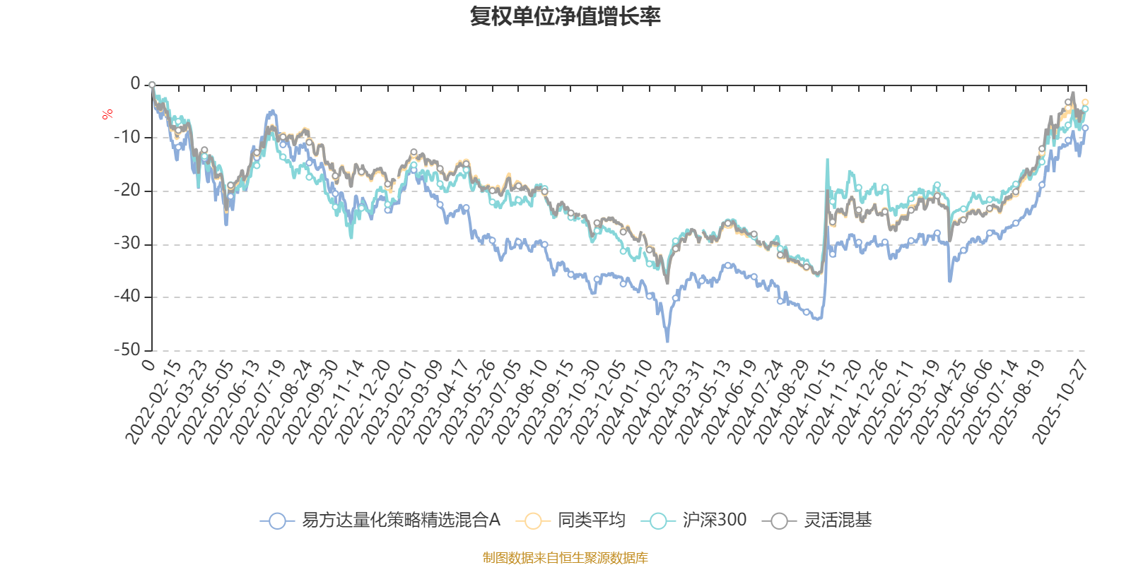 截至10月27日,易方达量化策略精选混合A近三个月复权单位净值增长率为21.71%,位于同类可比基金355/1287;近半年复权单位净值增长率为33.41%,位于同类可比基金413/1287;近一年复权单位净值增长率为30.85%,位于同类可比基金433/1287;近三年复权单位净值增长率为21.88%,位于同类可比基金488/1286。