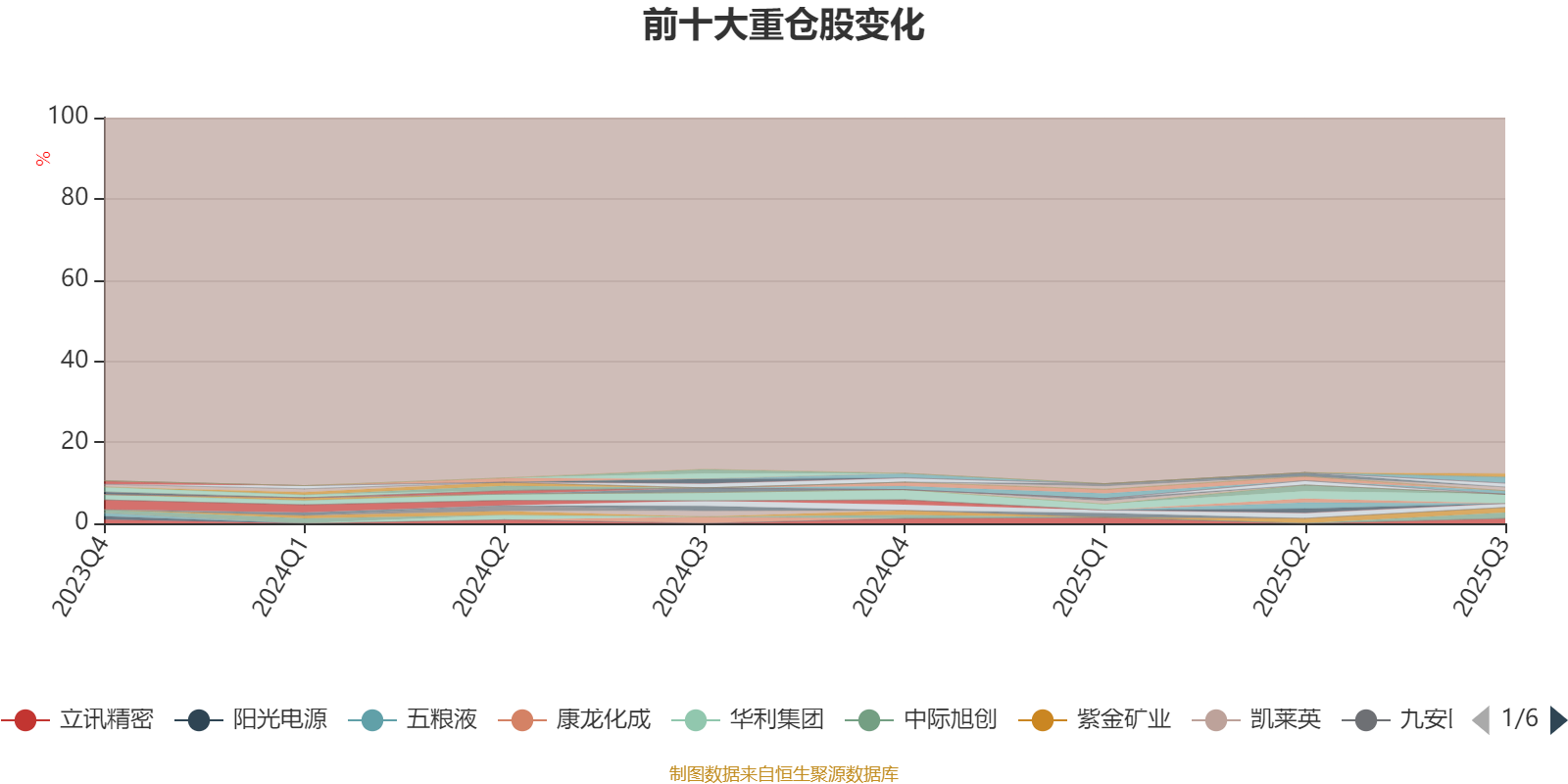 截至2025年三季度末,基金十大重仓股分别是宁德时代、新易盛、中际旭创、紫金矿业、立讯精密、美的集团、沪电股份、恒瑞医药、寒武纪、兆易创新。