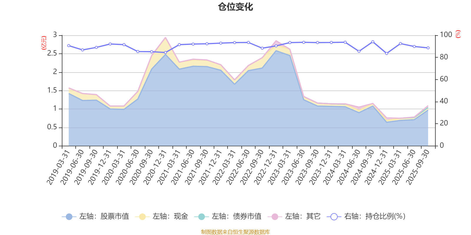 据定期报告数据统计,近三年平均股票仓位为91%,同类平均为72.14%。2024年三季度末基金达到94.12%的最高仓位,2024年末最低,为83.56%。
