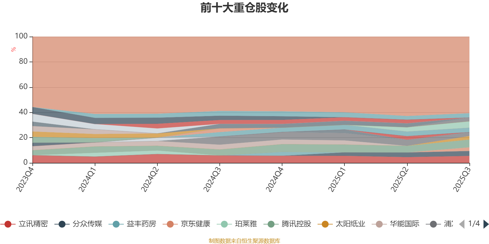 截至2025年三季度末,基金十大重仓股分别是腾讯控股、立讯精密、信达生物、分众传媒、安踏体育、华鲁恒升、浦发银行、瀚蓝环境、京东健康、太阳纸业。