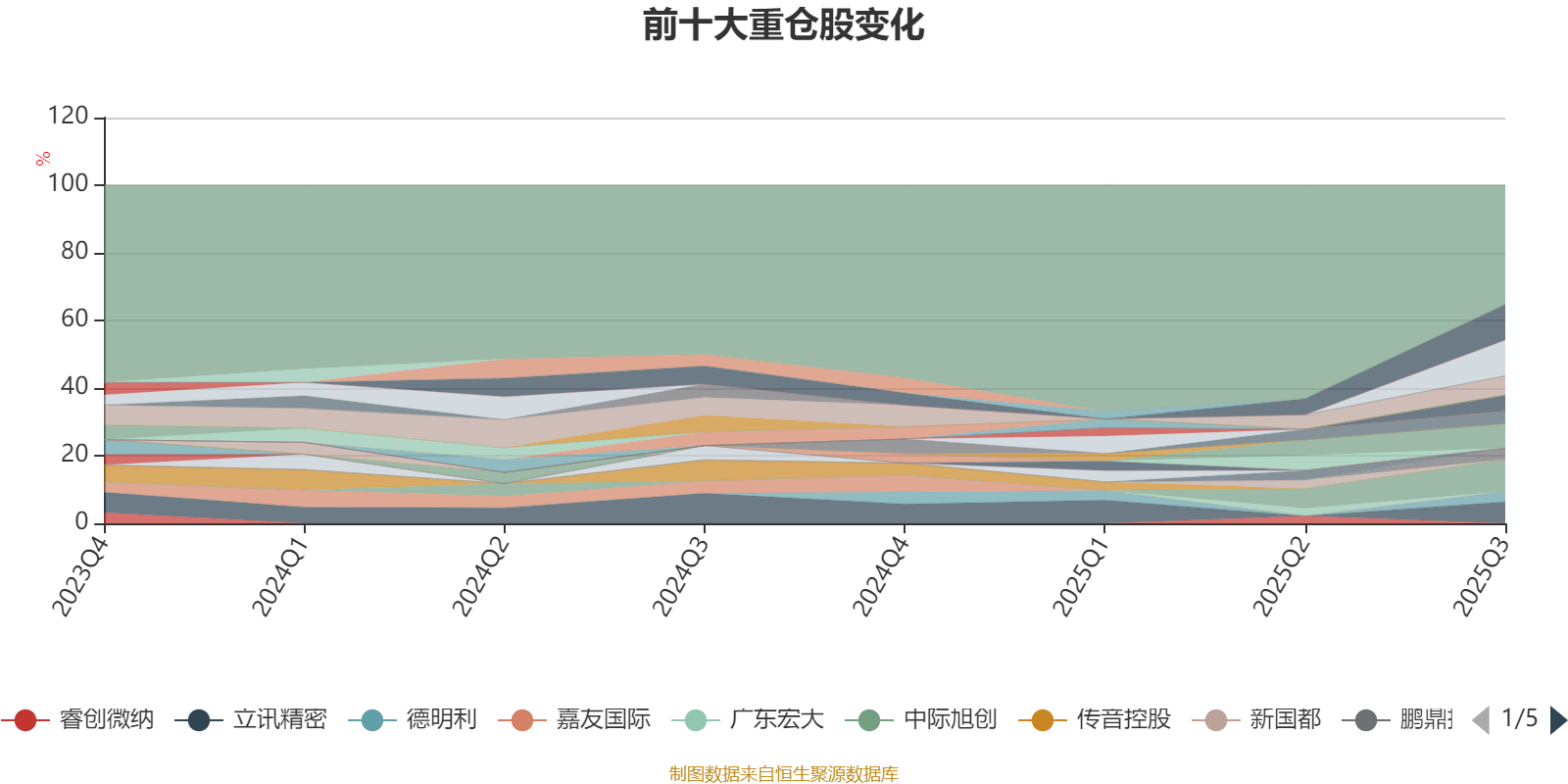 截至2025年三季度末,基金十大重仓股分别是新易盛、工业富联、中际旭创、深南电路、立讯精密、沪电股份、指南针、长川科技、鹏鼎控股、德明利。