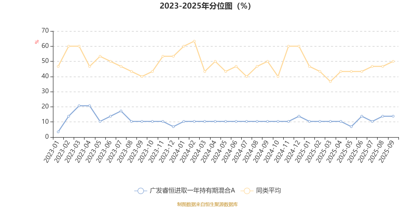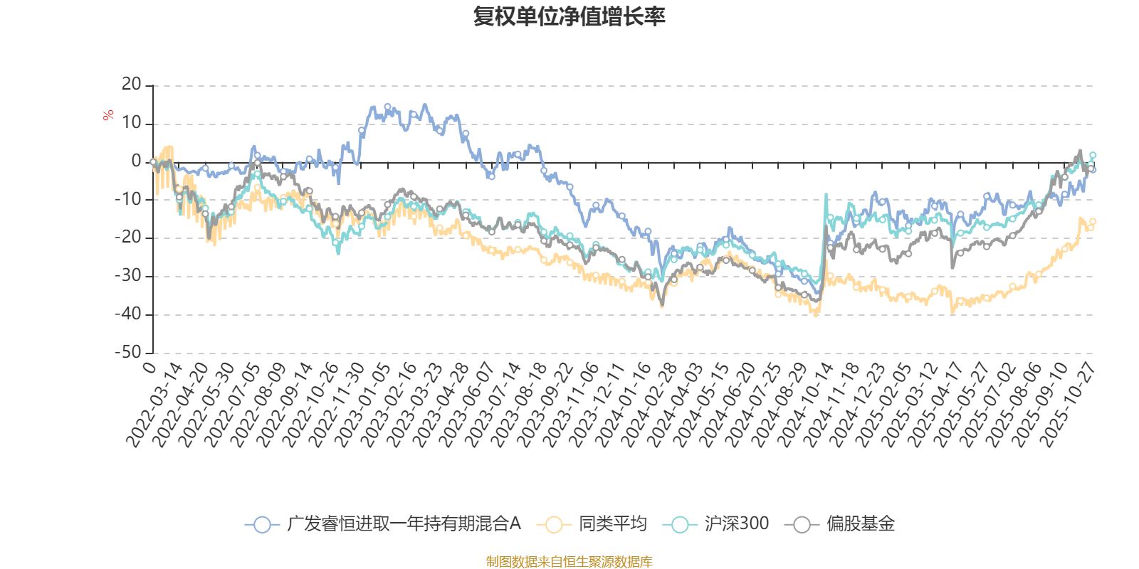 截至10月27日,广发睿恒进取一年持有期混合A近三个月复权单位净值增长率为5.85%,位于同类可比基金43/49;近半年复权单位净值增长率为17.11%,位于同类可比基金42/49;近一年复权单位净值增长率为22.21%,位于同类可比基金31/42;近三年复权单位净值增长率为-0.07%,位于同类可比基金24/29。