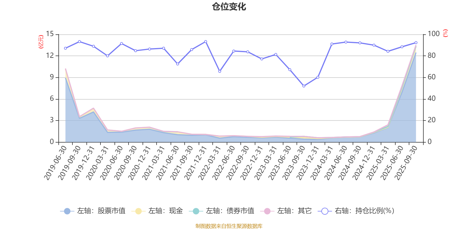 据定期报告数据统计,近三年平均股票仓位为80.75%,同类平均为85.91%。2021年末基金达到93.3%的最高仓位,2023年三季度末最低,为52.06%。