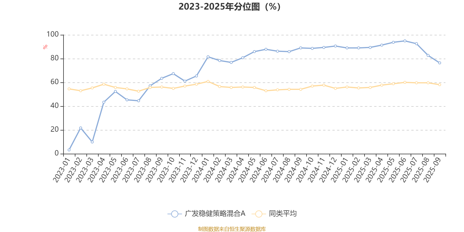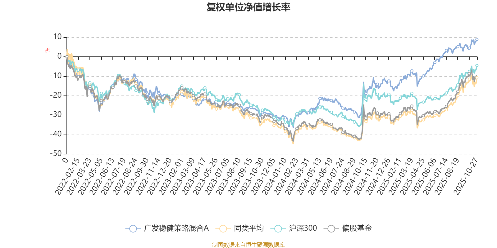 截至10月27日,广发稳健策略混合A近三个月复权单位净值增长率为4.77%,位于同类可比基金240/265;近半年复权单位净值增长率为20.87%,位于同类可比基金198/265;近一年复权单位净值增长率为29.69%,位于同类可比基金118/265;近三年复权单位净值增长率为34.23%,位于同类可比基金64/253。