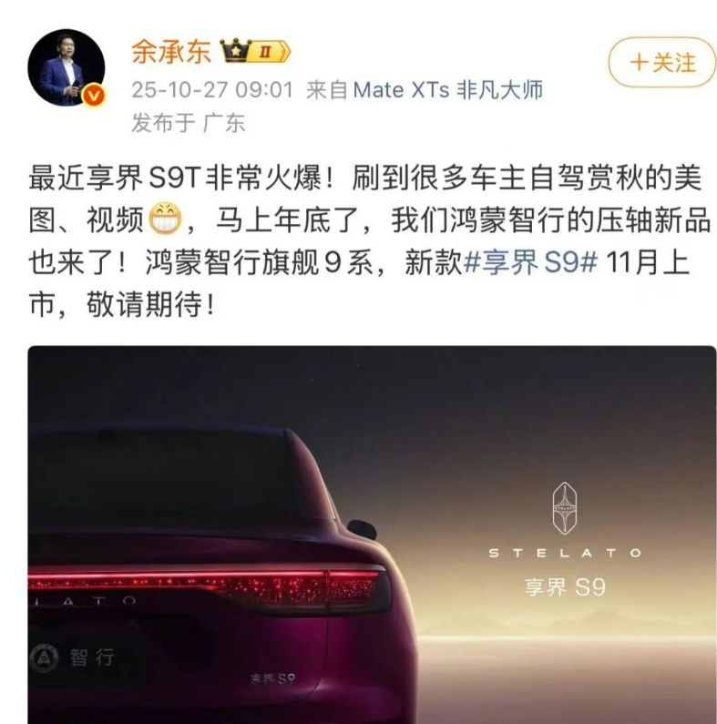 另据余承东微博10月27日发文称,鸿蒙智行旗舰9系,新款享界S9将于11月上市。