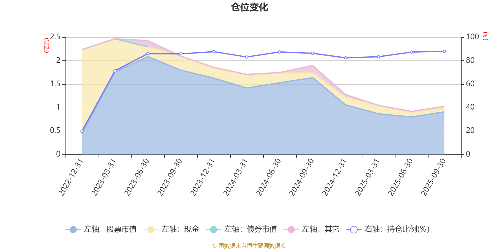 据定期报告数据统计,近三年平均股票仓位为79.15%,同类平均为86.77%。2025年三季度末基金达到88.1%的最高仓位,2022年末最低,为19.86%。