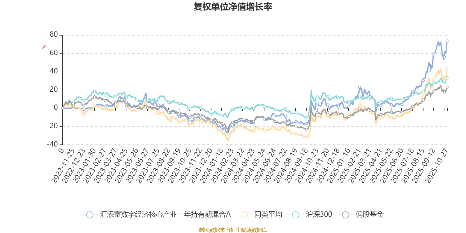 截至10月27日,汇添富数字经济核心产业一年持有期混合A近三个月复权单位净值增长率为45.28%,位于同类可比基金84/229;近半年复权单位净值增长率为65.28%,位于同类可比基金84/229;近一年复权单位净值增长率为67.19%,位于同类可比基金67/213。