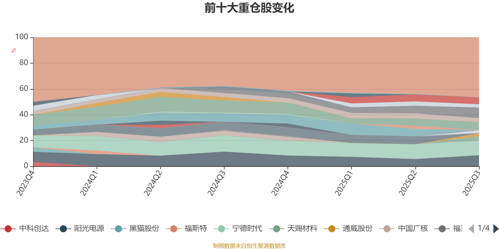 截至2025年三季度末,基金十大重仓股分别是宁德时代、阳光电源、亿纬锂能、长江电力、隆基绿能、天赐材料、拓普集团、三花智控、通威股份、广信科技。