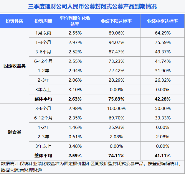 在2824只到期产品中,固定收益类、混合类分别有2713只、111只。到期产品综合业绩基准中枢达标率为41.11%,业绩基准下限达标率为74.11%。