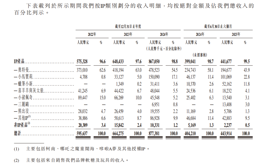 其中,前五大IP贡献的收入占比分别为90%、88.7%和85.9%,2025年上半年达85.7%。比如,奥特曼这一IP贡献了公司的最大营收。2022年至2025年前6个月,其营收分别为3.73亿元、4.19亿元、4.79亿元和1.95亿元,占营收的比重分别达62.6%、63%、54.5%和43.9%。