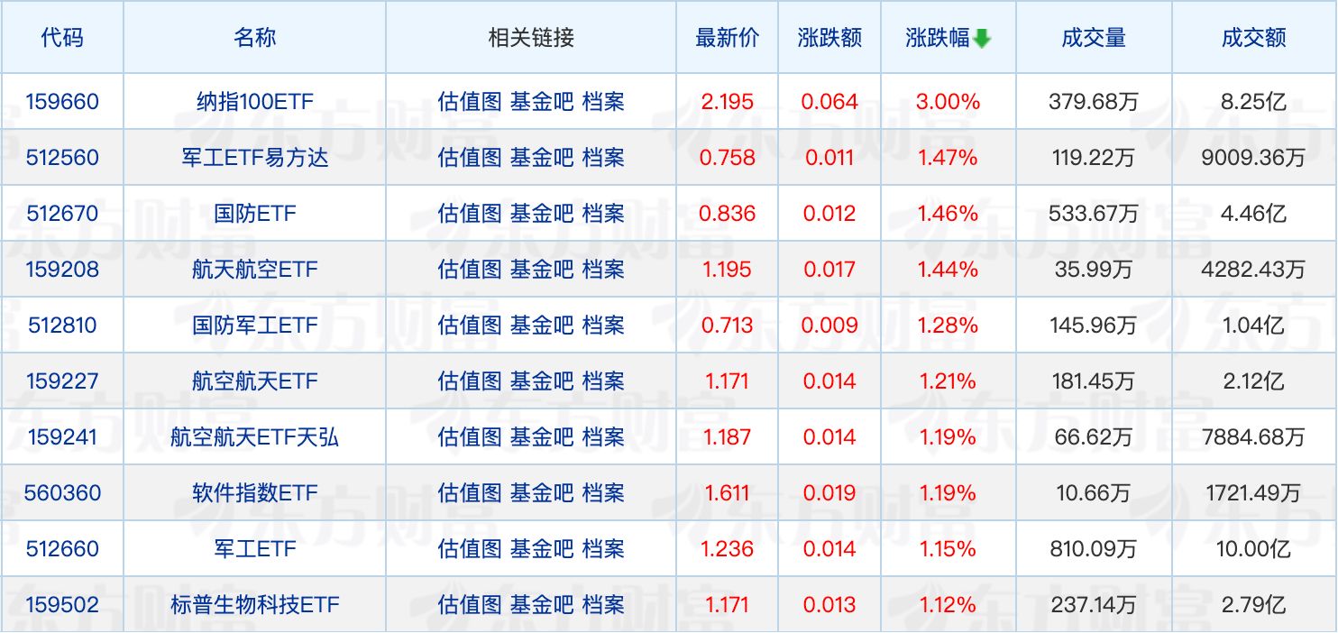 具体来看,纳指100ETF领涨3.00%。军工板块盘中快速拉升,江龙船艇直线20cm涨停,国防军工、航空航天相关ETF集体走强。
