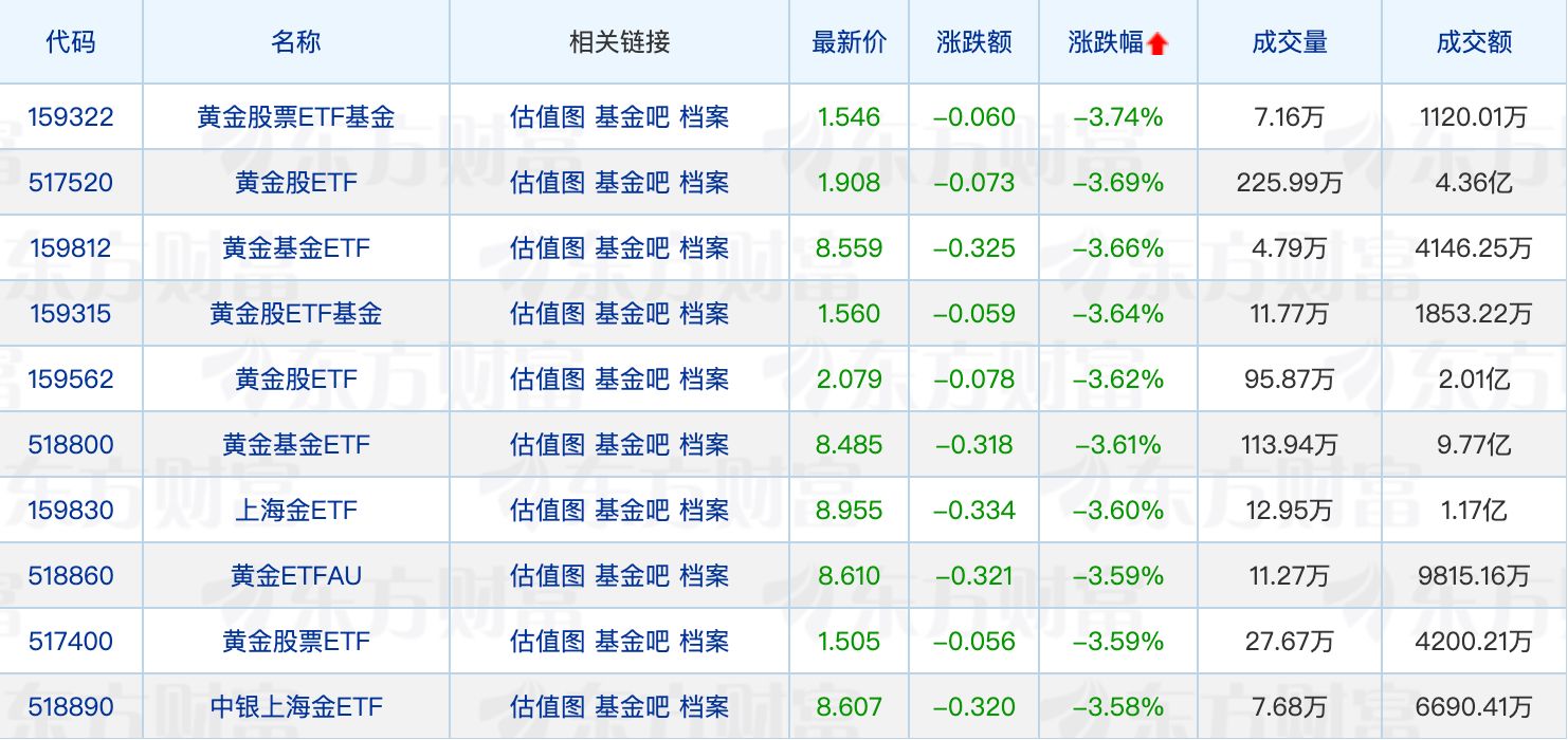 下跌方面,黄金股相关ETF全线回调,最高下跌3.74%。