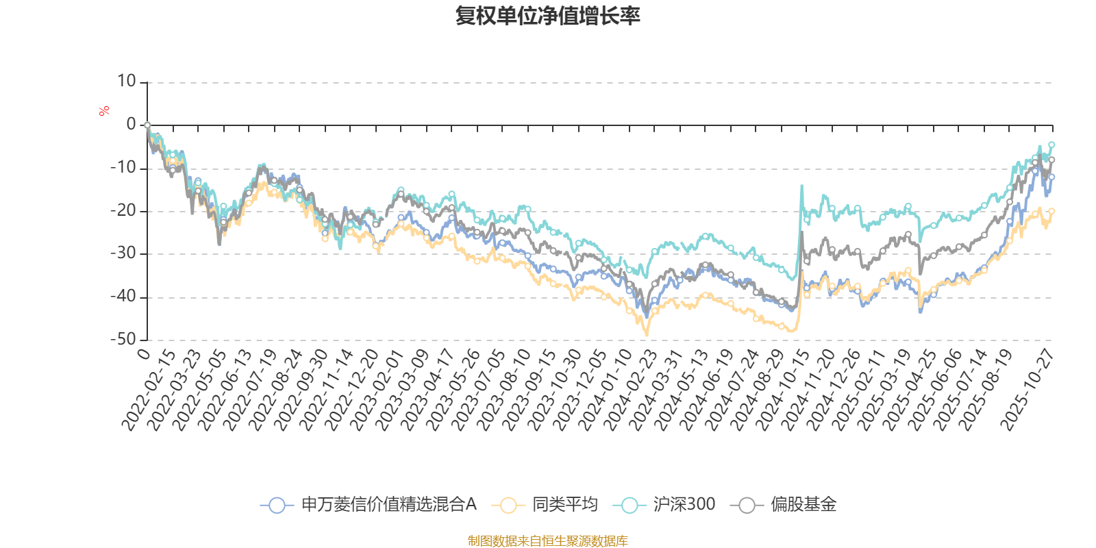 截至10月27日,申万菱信价值精选混合A近三个月复权单位净值增长率为26.45%,位于同类可比基金127/689;近半年复权单位净值增长率为45.25%,位于同类可比基金107/688;近一年复权单位净值增长率为39.49%,位于同类可比基金164/653;近三年复权单位净值增长率为14.36%,位于同类可比基金176/364。