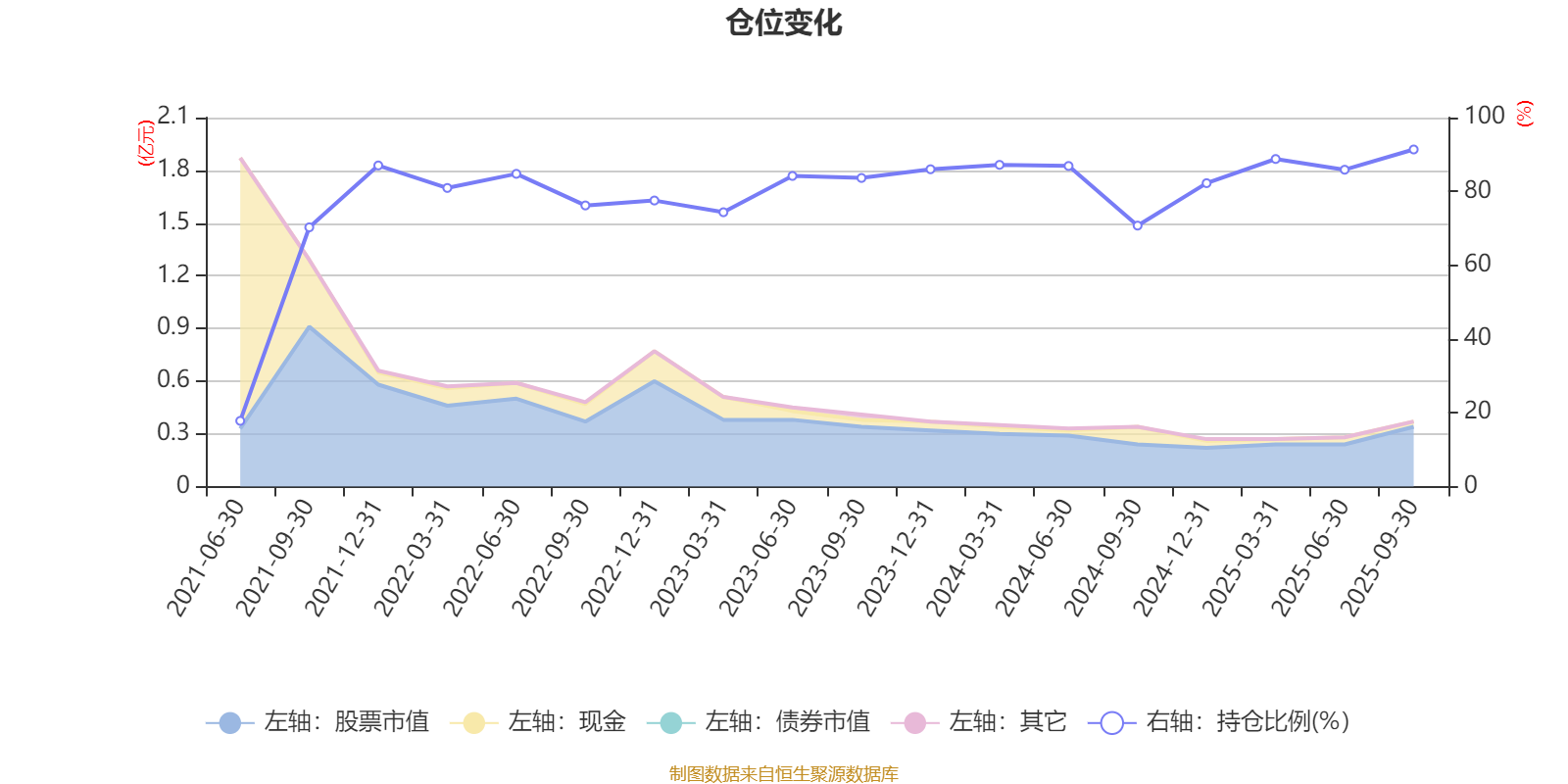 据定期报告数据统计,近三年平均股票仓位为83.23%,同类平均为83.73%。2025年三季度末基金达到91.36%的最高仓位,2021年上半年末最低,为17.81%。