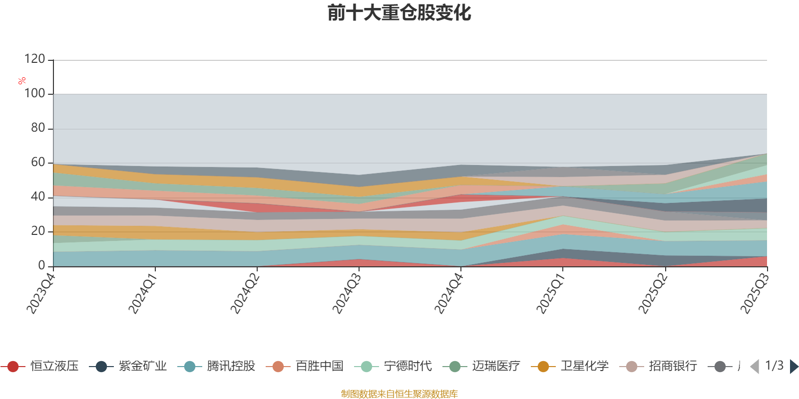 该基金持股集中度较高。截至2025年三季度末,基金十大重仓股分别是阿里巴巴-W、腾讯控股、中芯国际、宁德时代、快手-W、恒立液压、中国有色矿业、东方雨虹、招商银行、三花智控。