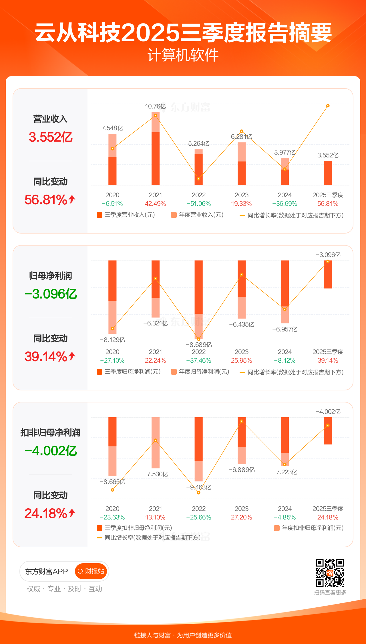 云从科技10月29日发布2025年三季报显示,公司前三季实现营业收入3.55亿元,同比增长56.81%;归母净利润-3.10亿元;扣非归母净利润-4.00亿元。