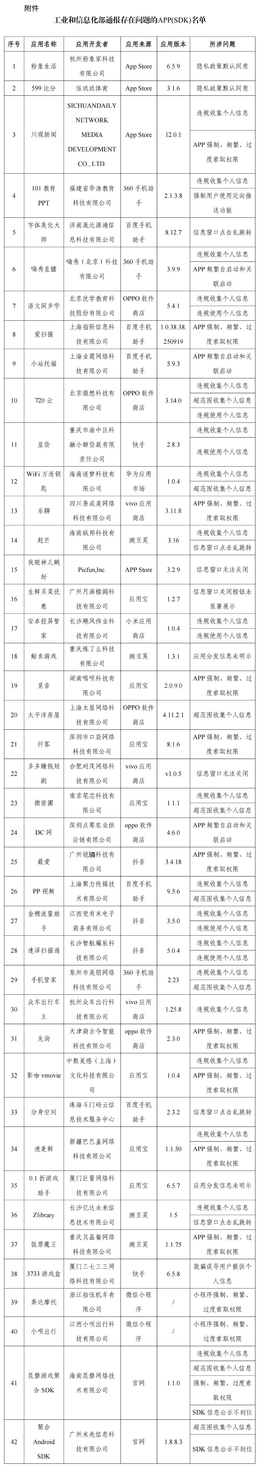 附件:工业和信息化部通报存在问题的APP(SDK)名单