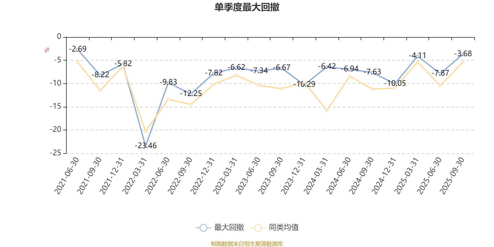 截至10月27日,基金近三年最大回撤为19.52%,同类可比基金排名16/251。单季度最大回撤出现在2022年一季度,为23.46%。