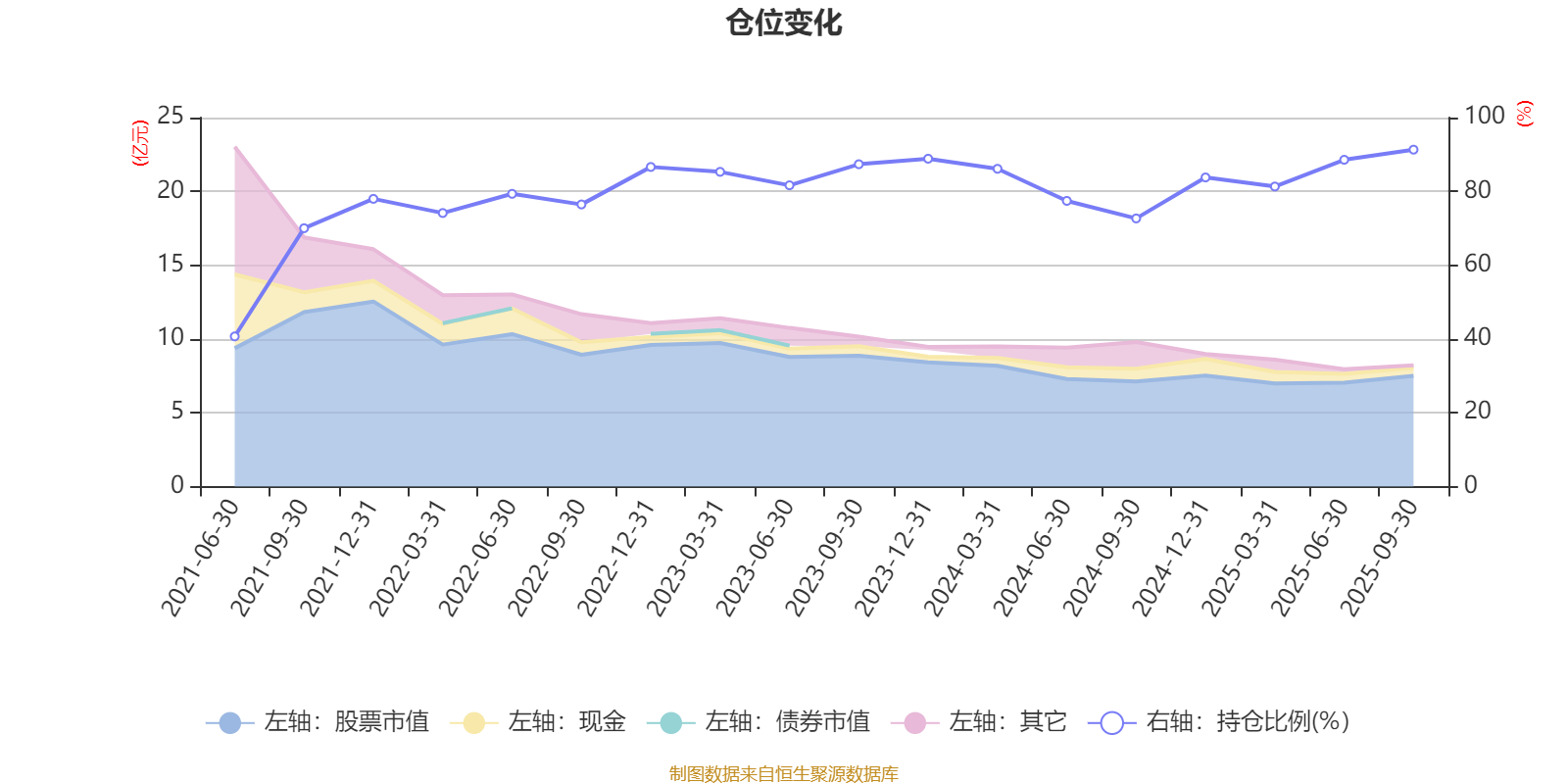 据定期报告数据统计,近三年平均股票仓位为84.25%,同类平均为85.91%。2025年三季度末基金达到91.31%的最高仓位,2021年上半年末最低,为40.7%。
