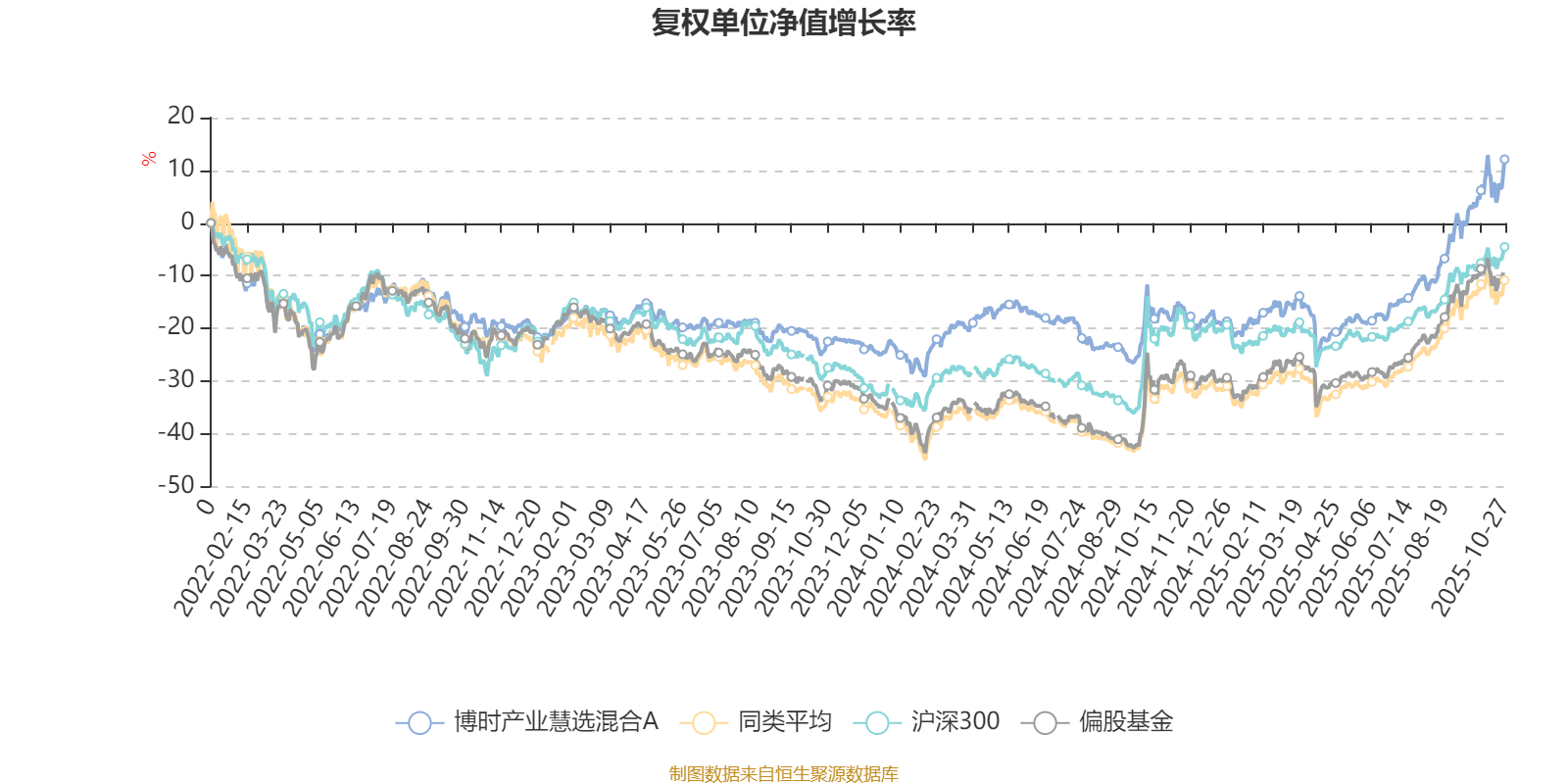 截至10月27日,博时产业慧选混合A近三个月复权单位净值增长率为25.75%,位于同类可比基金60/265;近半年复权单位净值增长率为41.27%,位于同类可比基金62/265;近一年复权单位净值增长率为34.80%,位于同类可比基金85/265;近三年复权单位净值增长率为38.61%,位于同类可比基金49/253。