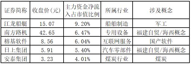 主力资金净流入金额占市值比例排名前5的个股分别为江龙船艇、南方路机、榕基软件、日上集团、安泰集团。