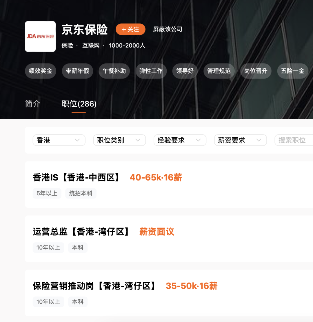 在相关招聘平台上,可以看到京东在以“京东”“京东保险”“京东科技”等名义,招聘保险相关岗位,包括合规负责人(香港)、保险TR、保险顾问IS、运营总监、保险出单员、保险营销推动岗、香港IS等职位,业务拓展动作十分迅速。