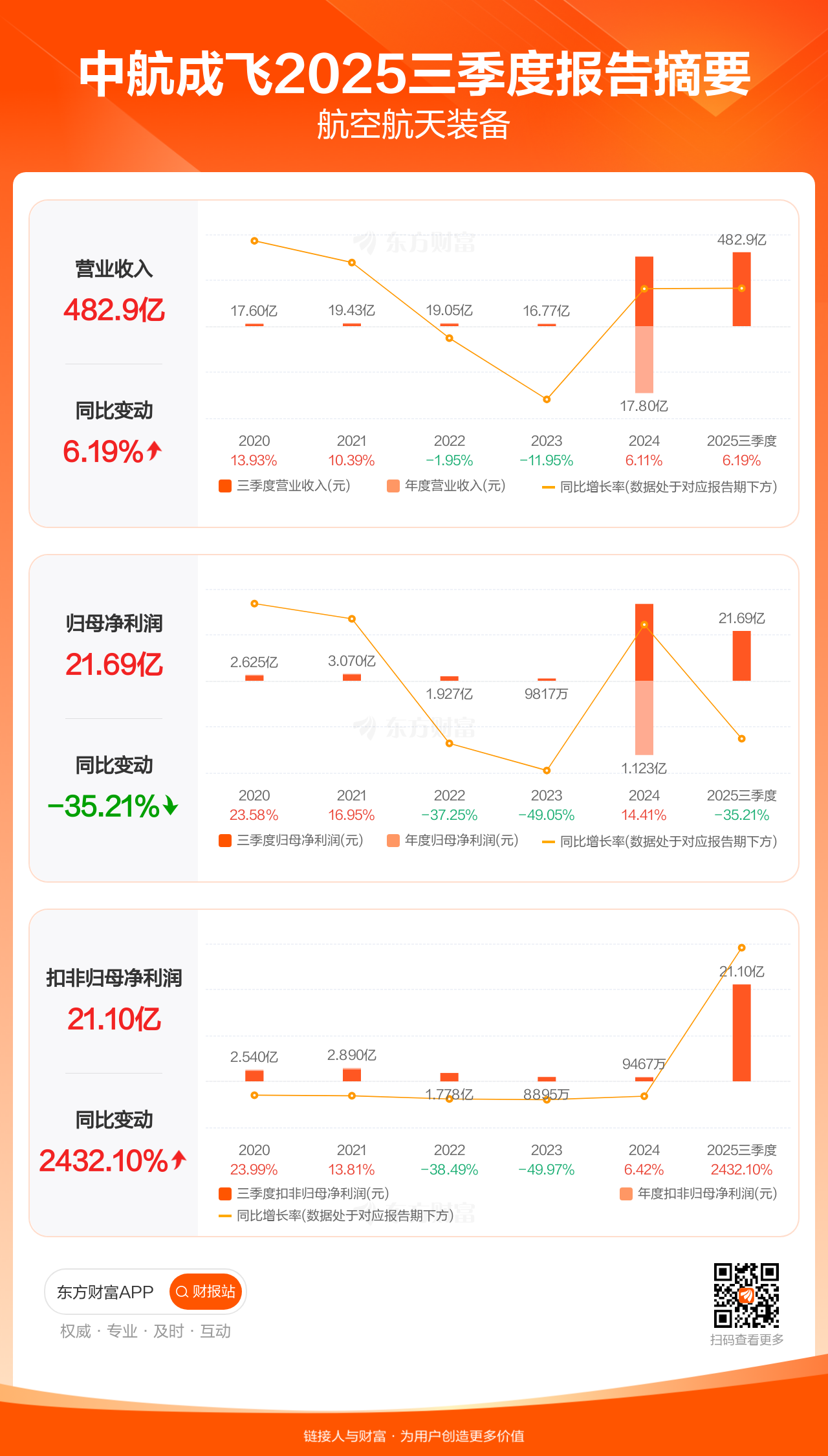 中航成飞10月29日发布2025年三季报显示,公司前三季实现营业收入482.86亿元,同比增长6.19%;归母净利润21.69亿元,同比下滑35.21%;扣非归母净利润21.10亿元,同比增长2432.10%。