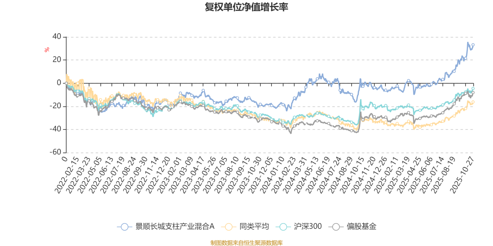 截至10月27日,景顺长城支柱产业混合A近三个月复权单位净值增长率为22.20%,位于同类可比基金20/49;近半年复权单位净值增长率为37.78%,位于同类可比基金23/49;近一年复权单位净值增长率为35.26%,位于同类可比基金18/42;近三年复权单位净值增长率为67.19%,位于同类可比基金2/29。