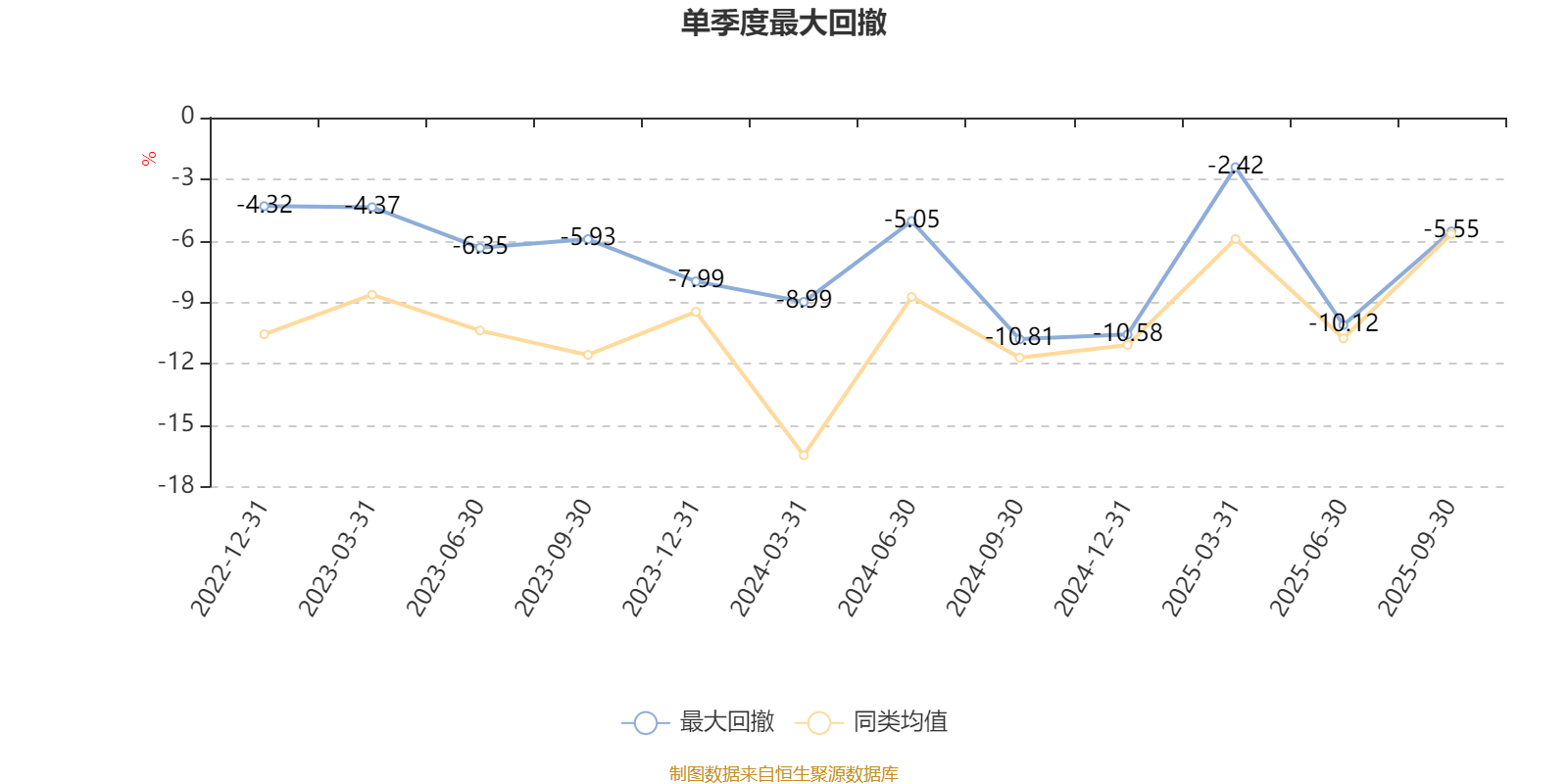 截至10月27日,基金近三年最大回撤为18.87%,同类可比基金排名16/513。单季度最大回撤出现在2024年三季度,为10.81%。