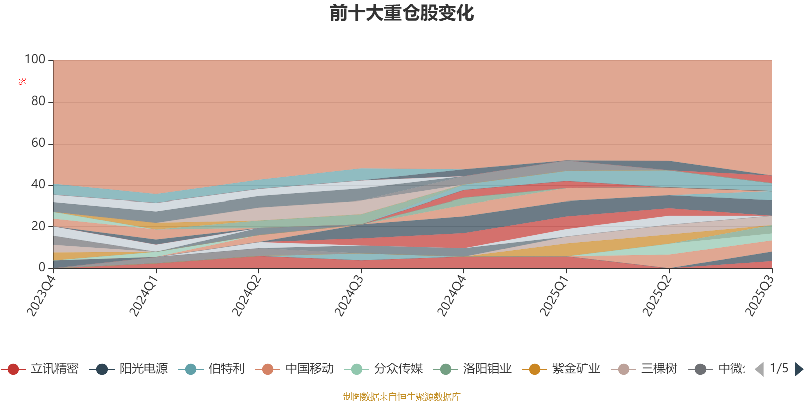 截至2025年三季度末,基金十大重仓股分别是宁德时代、中国移动、阳光电源、三棵树、小商品城、洛阳钼业、思特威、华友钴业、立讯精密、分众传媒。