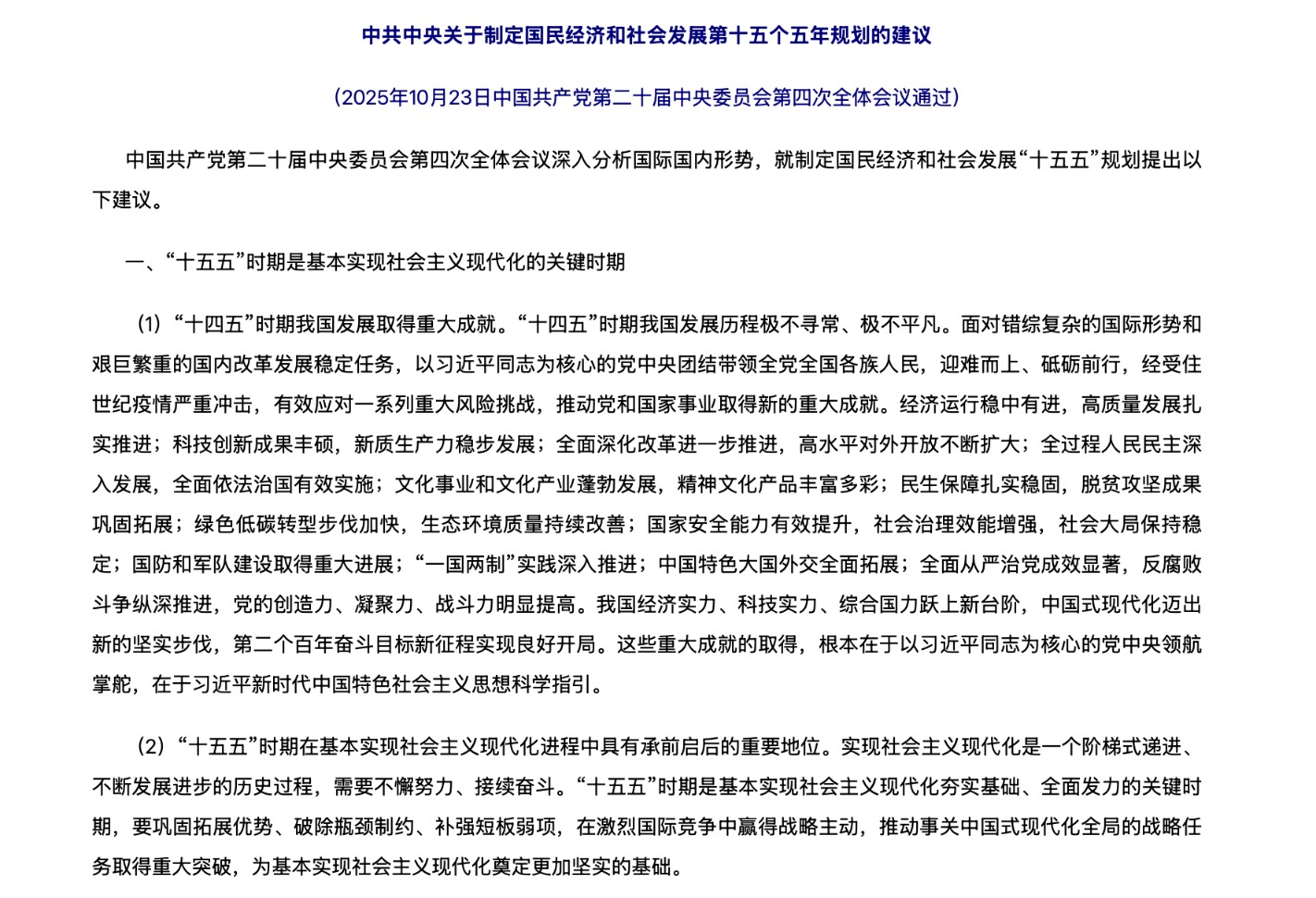 10月28日,新华社发布《中共中央关于制定国民经济和社会发展第十五个五年规划的建议》(下称《建议》)。
