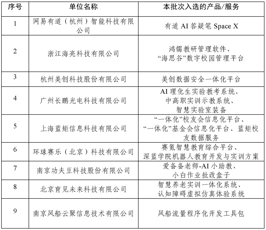 本批名录经过自愿申报、材料审查、专家评审,共有9家企业的17项产品服务最终入选,入选名单如下: