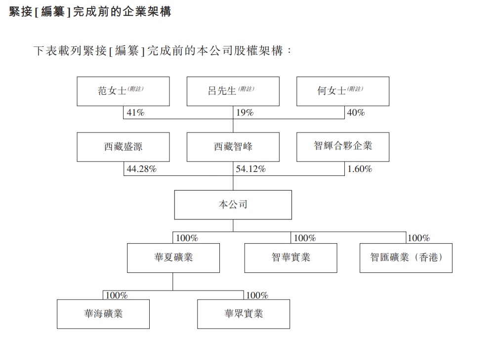 截至提交申请材料前,西藏智汇矿业的大股东为西藏智峰,后者持有公司54.12%的股份,西藏国资控制的西藏盛源持有44.28%的股份,员工持股平台智辉合伙持有1.6%的股份。