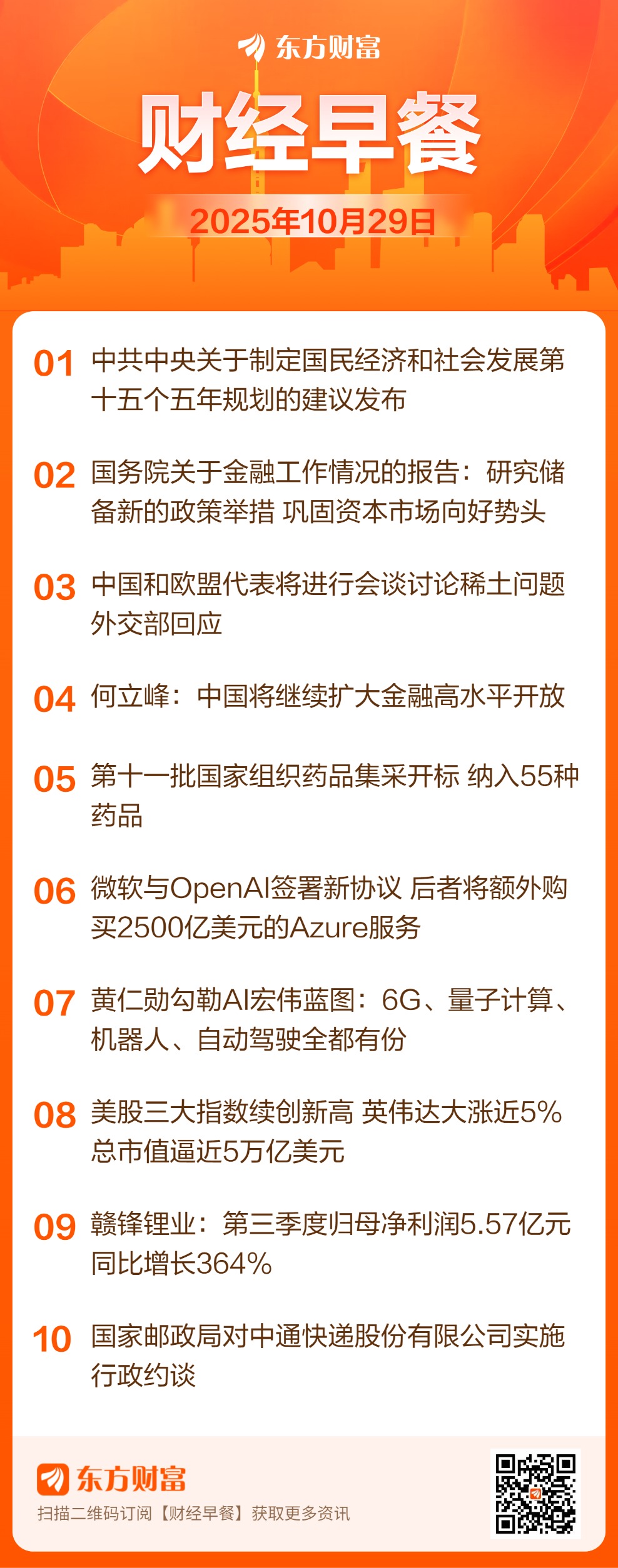 中共中央关于制定国民经济和社会发展第十五个五年规划的建议发布。其中指出,加快新能源、新材料、航空航天、低空经济等战略性新兴产业集群发展。前瞻布局未来产业,探索多元技术路线、典型应用场景、可行商业模式、市场监管规则,推动量子科技、生物制造、氢能和核聚变能、脑机接口、具身智能、第六代移动通信等成为新的经济增长点。
