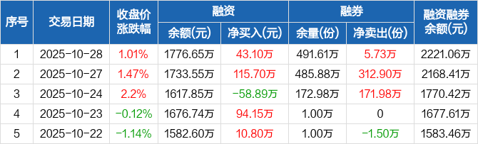 融资方面,当日融资买入693.17万元,融资偿还650.07万元,融资净买入43.1万元。融券方面,融券卖出7.7万份,融券偿还1.97万份,融券余量491.61万份,融券余额444.42万元。融资融券余额合计2221.06万元。