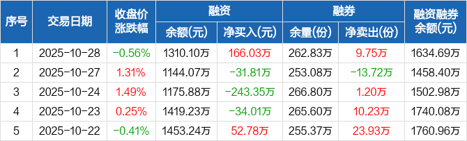 A500ETF南方:融资净买入166.03万元,融资余额1310.1万元(10-28)