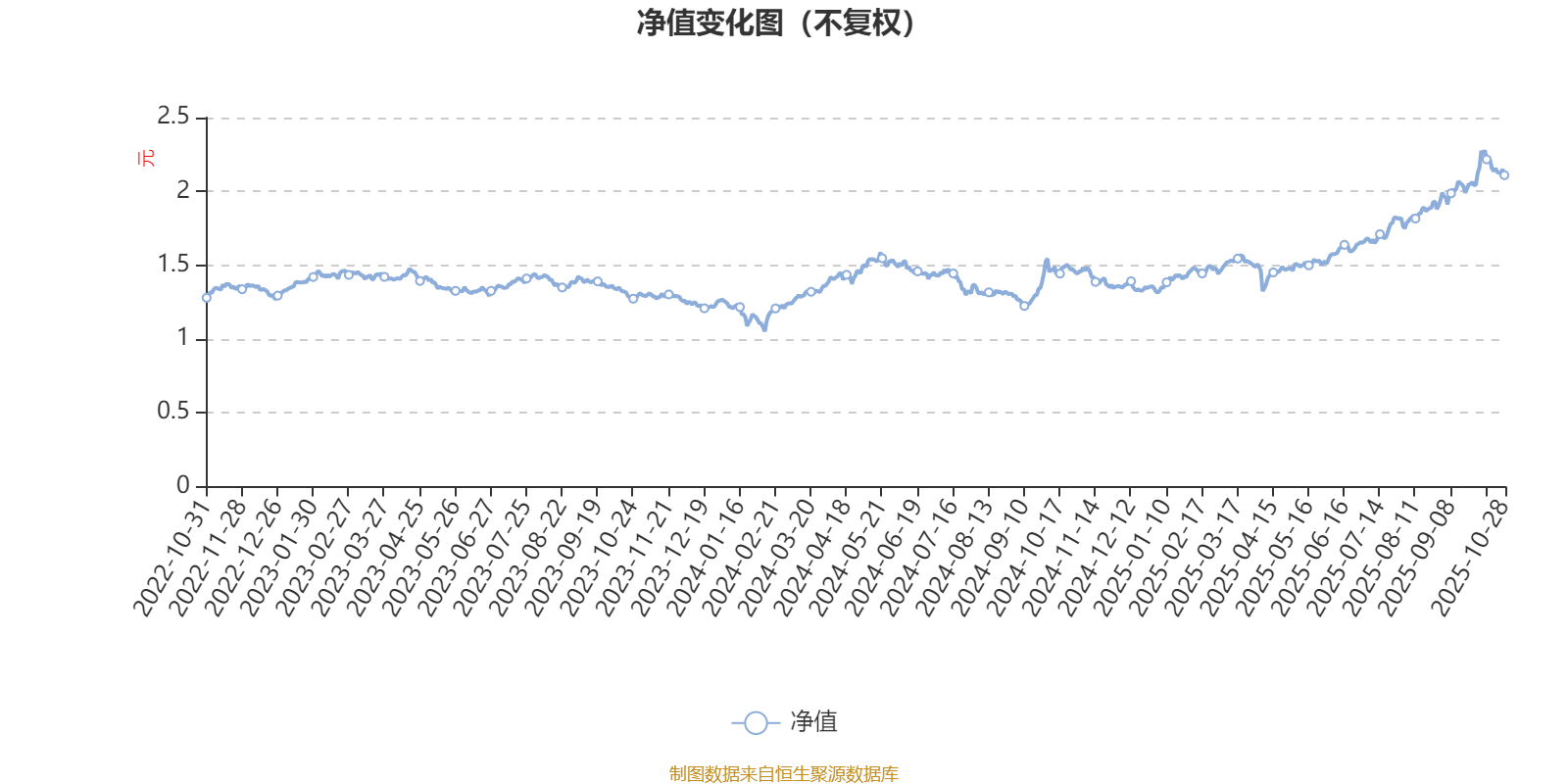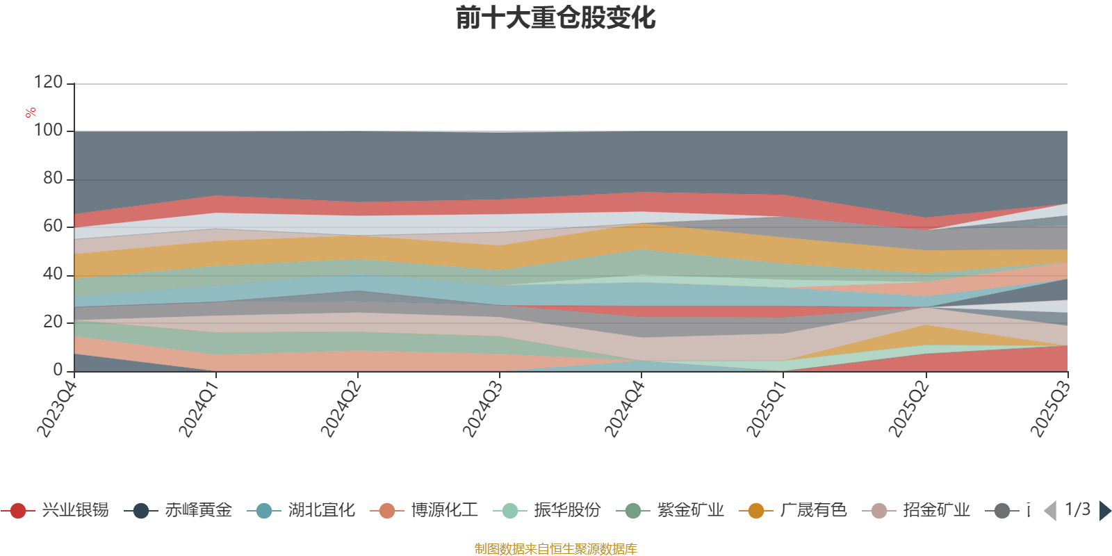 该基金持股集中度较高,近2年前十大重仓股集中度长期超过60%。截至2025年三季度末,基金十大重仓股分别是兴业银锡、山东黄金、锡业股份、招金矿业、HTSC(06886)、中金黄金、中曼石油、赛轮轮胎、中远海能、海南橡胶。