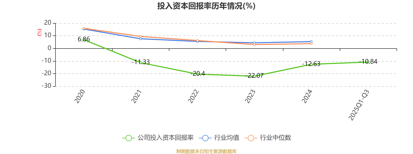 公司2025年前三季度投入资本回报率为-10.84%,较上年同期下降3.24个百分点。