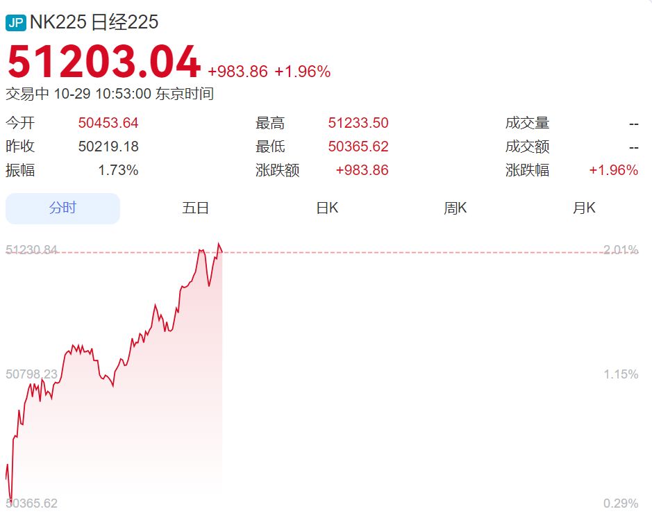 10月29日盘中,日经225指数持续走高,一度突破51000点,为历史首次,日内涨1.96%。