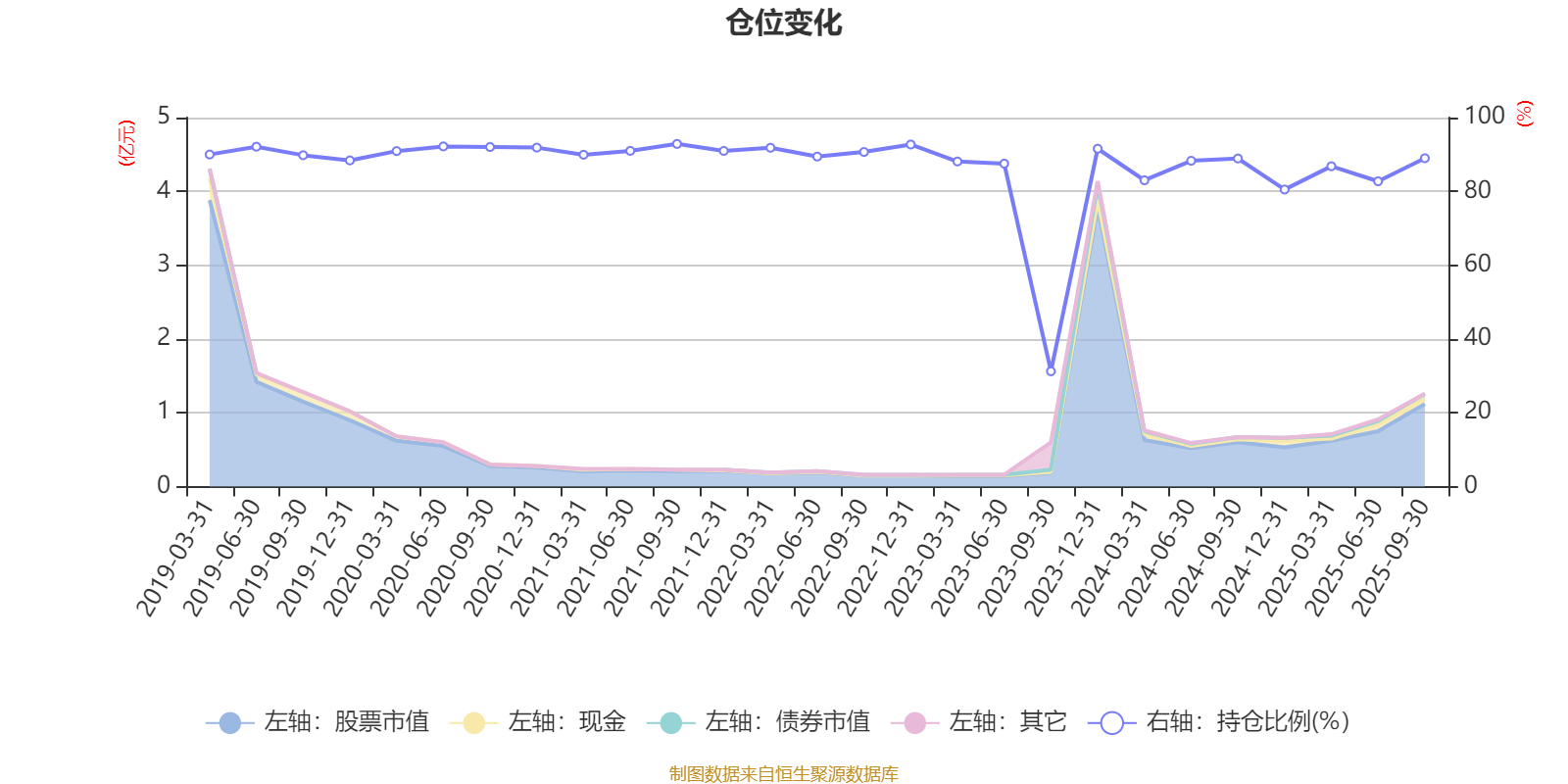 据定期报告数据统计,近三年平均股票仓位为82.54%,同类平均为72.35%。2021年三季度末基金达到92.87%的最高仓位,2023年三季度末最低,为31.24%。